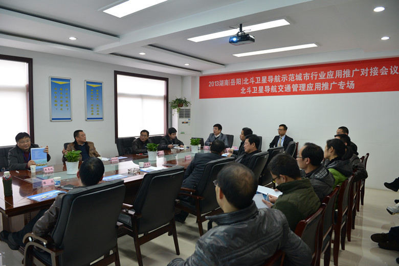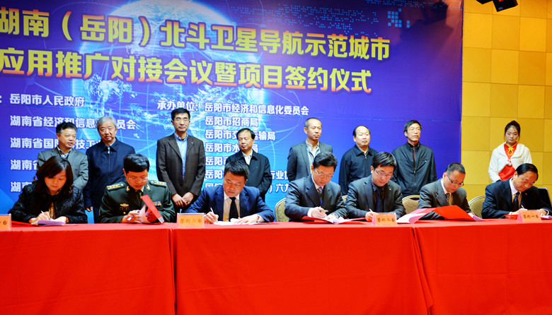 2013年12月17日上午,2013湖南(岳阳)北斗卫星导航示范城市行业应用推广对接会暨项目签约仪式在我市举行。活动以企业形象和产品展览、合作交流、项目签约、高峰论坛等形式,全面展示了我市北斗卫星导航行业应用及产业发展情况 。省政协副主席张大方,总装电子信息基础部副部长兼北斗二号卫星工程副总设计师杨长风,省经信委主任谢超英,市长盛荣华,副市长向伟雄,及省直相关部门负责人出席。